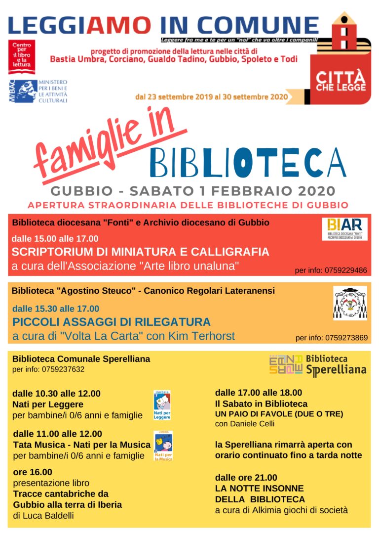 FAMIGLIE IN BIBLIOTECAsabato 1 febbraio 2020 Con capofila Spoleto, le città di Bastia Umbra, Corciano, Gualdo Tadino Gubbio e Todi,…