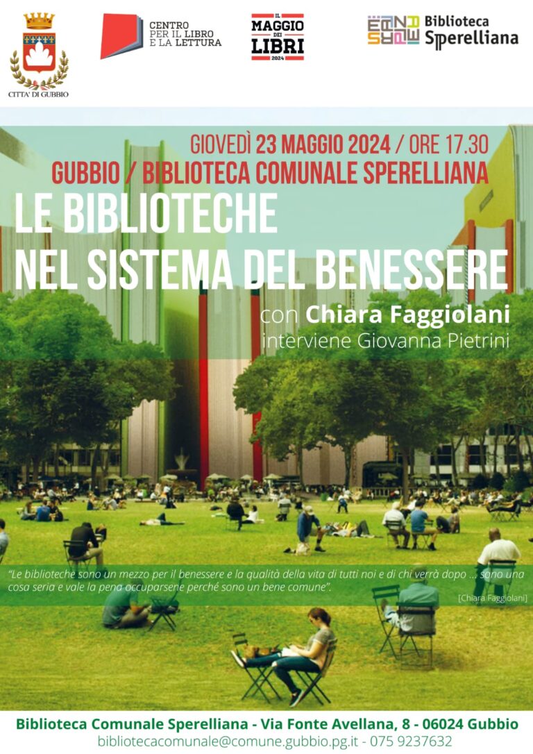 incontro con Chiara Faggiolani, Università La Sapienzagiovedì 23 maggio 2024, ore 17,30 Le biblioteche nel sistema del benessere “Le biblioteche…