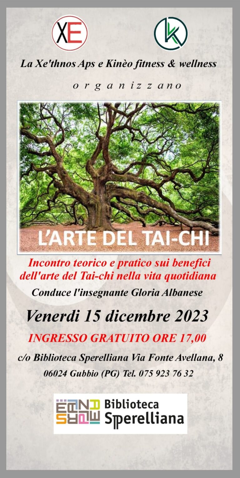 lezione teorico-pratica con l’insegnante Gloria Albanesevenerdì 15 dicembre 2023 alle ore 17.00 I benefici del Tai-Chi nella vita quotidiana. L’arte…