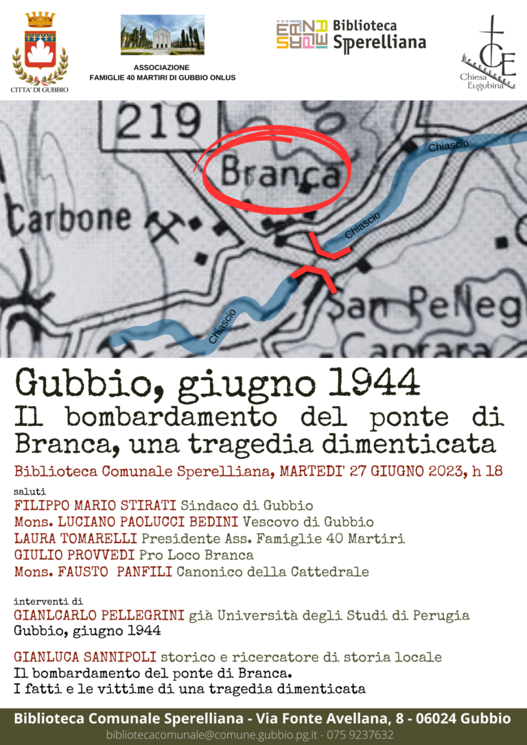 Il bombardamento del ponte di Branca. Una tragedia dimenticatamartedì 27 giugno 2023, ore 18.00 “Nelle immediate vicinanze di Gubbio si…
