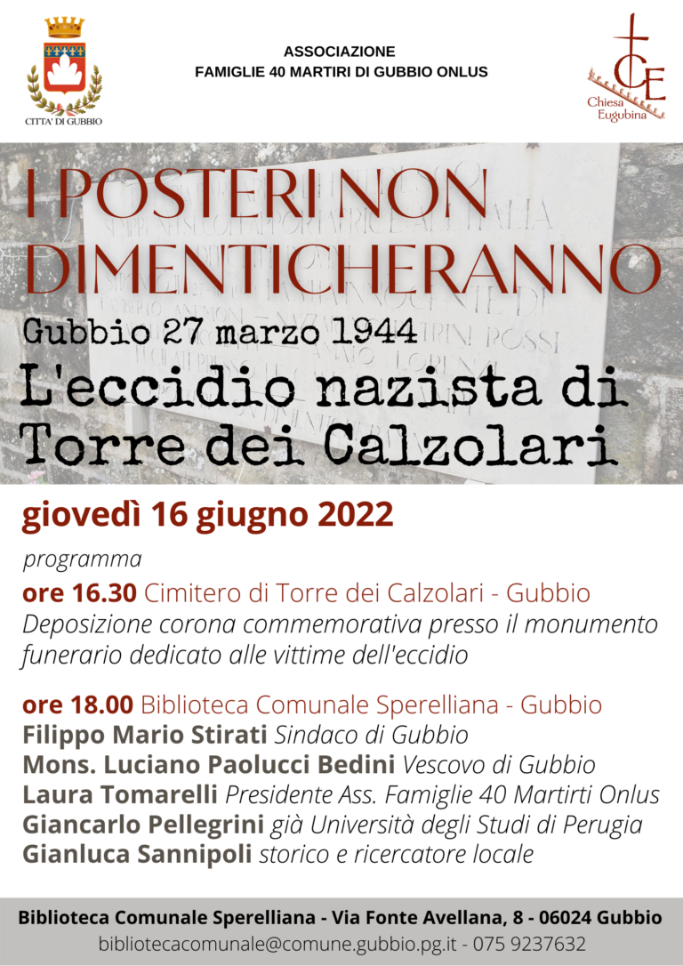commemorazione dell’eccidio nazista di Torre dei Calzolari del 27 marzo del 1944 I POSTERI NON DIMENTICHERANNO giovedì 16 giugno 2022Gubbio,…